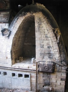 You can see the general design in this photo.  You can also see the signs of wear in the outer layer, on the right in the photo.  This kiln was built about 10 years ago, and has likely seen over 100 firings.  Back in the day, students also introduced salt into the kiln, which eats away at brick pretty quickly.  They stopped using salt by the time I came to MHCC in ’05, but since then I’ve seen the floor rebuilt, in addition to spot repairs in the interior arch, firebox and flue.
