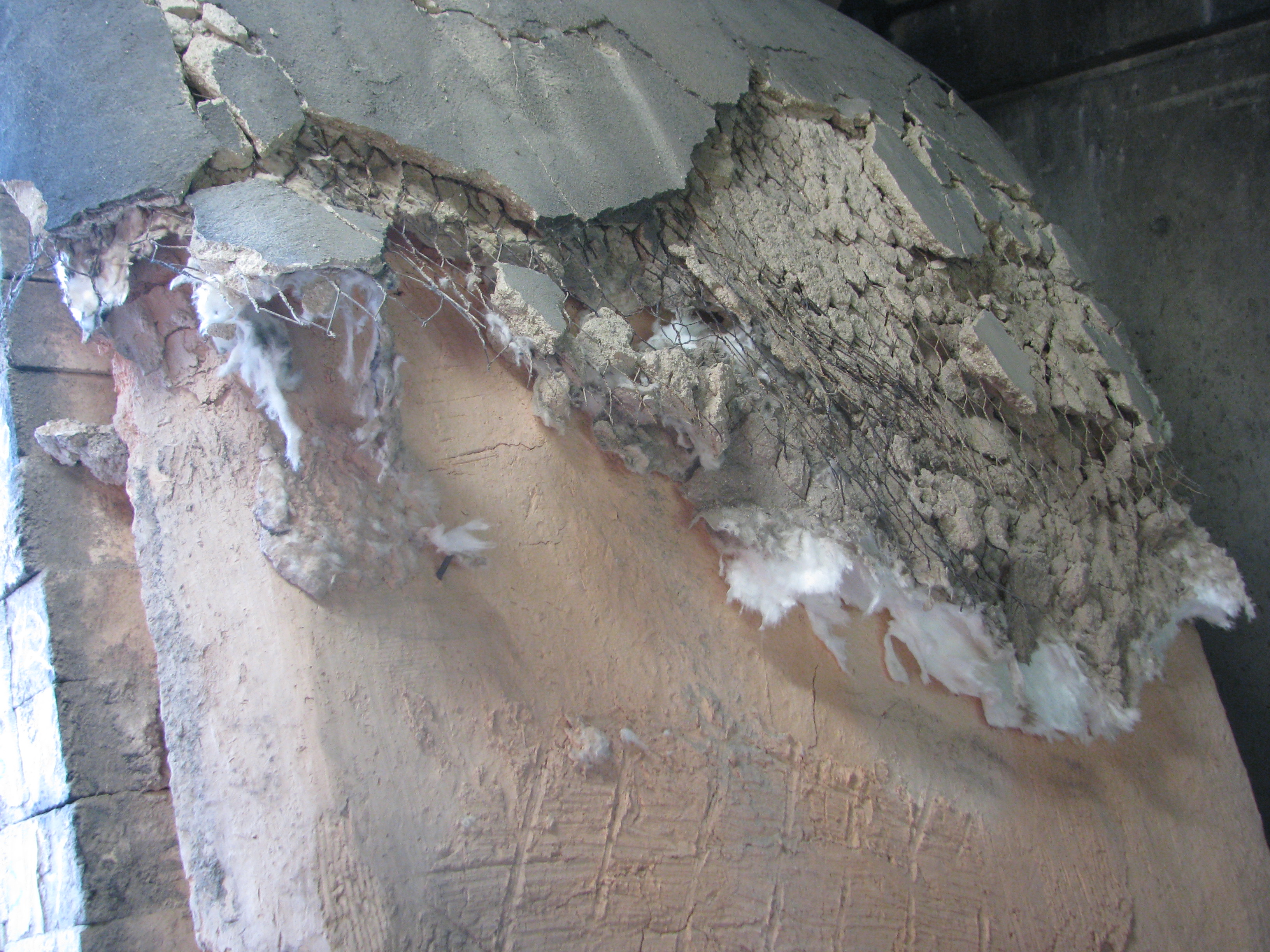 The first step in the demolition was to tear off the insulating layer covering the hard brick catenary arch.  Turned out, this layer was composed of about 3″ of clay, covered in kaowool, chicken wire and, finally on top, a thin layer of refractory cement.