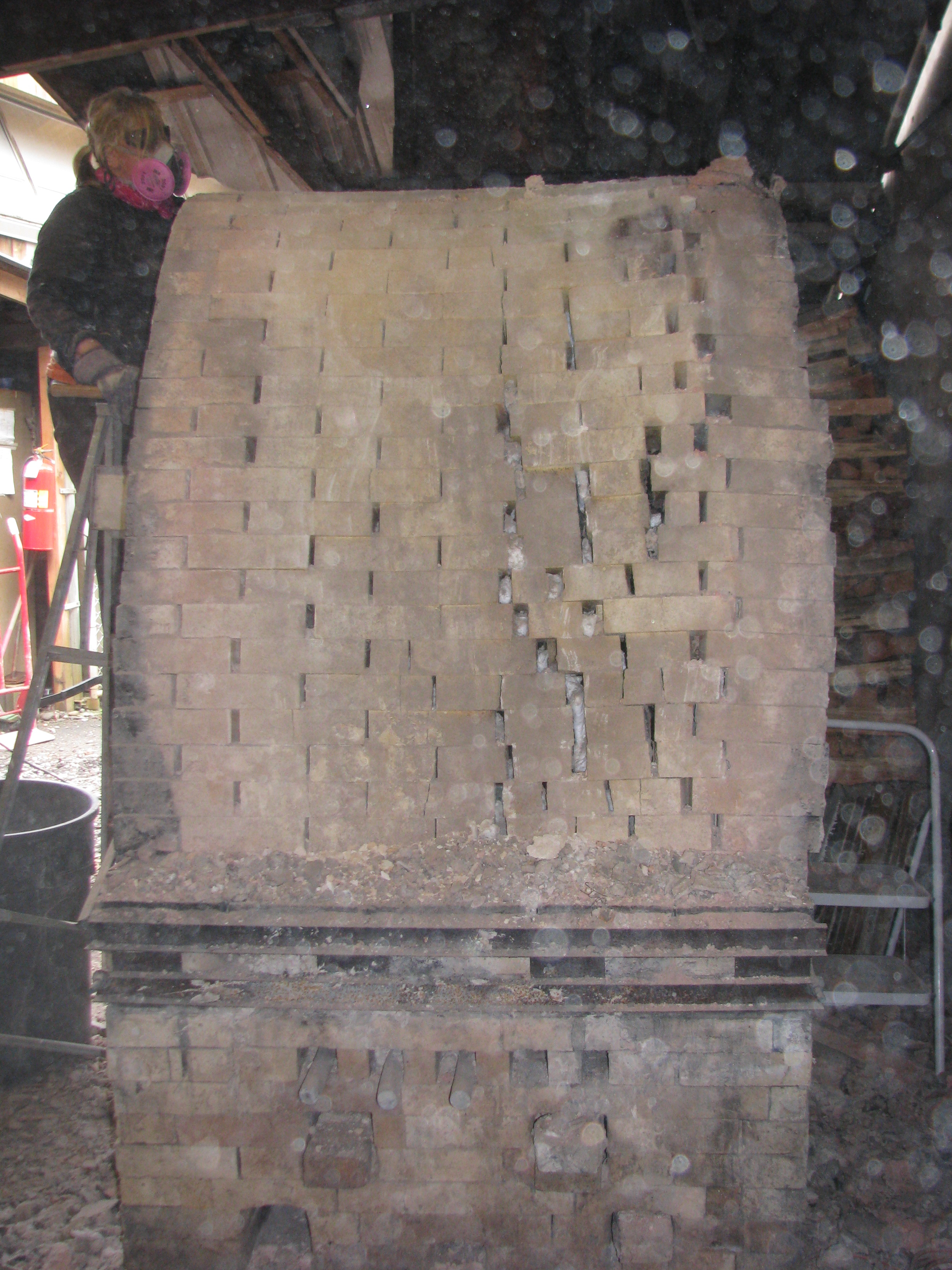Obviously, LW needed a new arch.  This one could have come crashing down on the next firing.  After we removed all the clay, wool and wire, Jeannette tore out the back wall before tackling the arch itself.