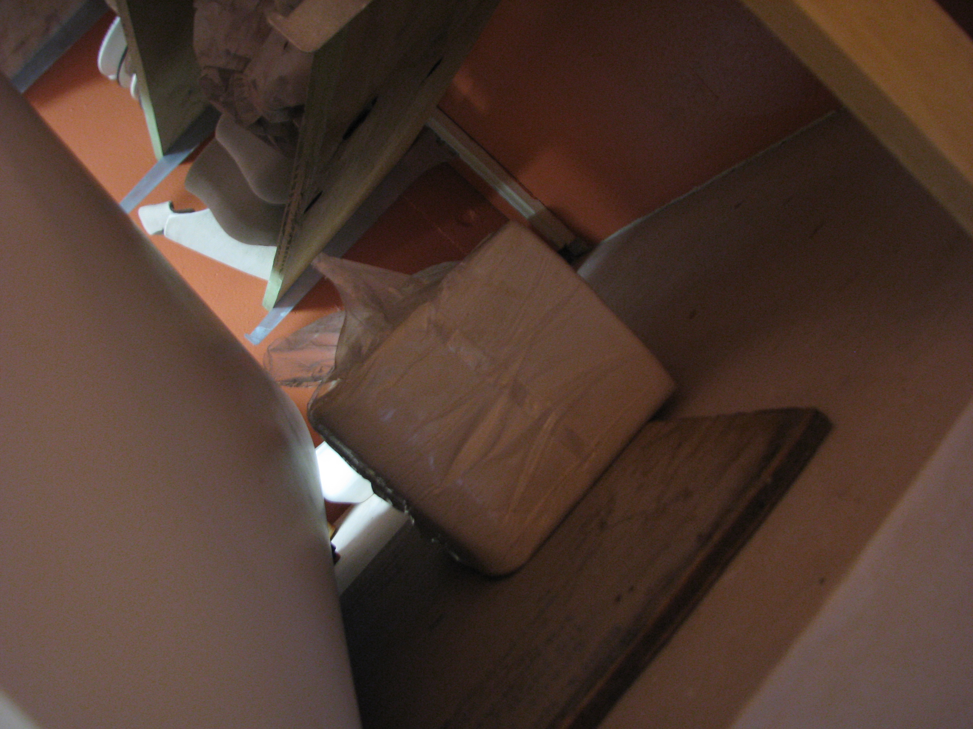 I don’t have a table large enough to accommodate the drape I need to create with the Varitone background, so I found a piece of chipboard in the kiln barn to create an extension to one of my work tables. I nabbed the heaviest thing I could find, a bag of clay, to keep it in place.
